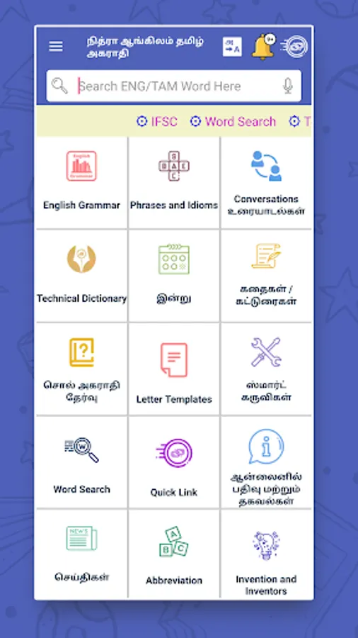 This offline English Tamil dictionary is designed to help Tamil speakers to improve their communication skill. This app provides opportunity to search and find the translation of any word.