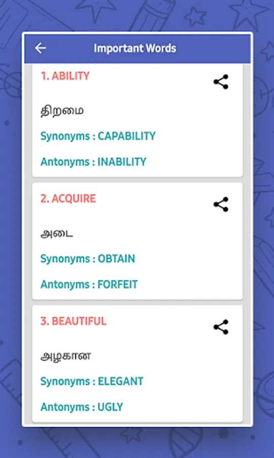 2. Auto suggestion available in this Eng to Tam dictionary app displays the related words with the word you search.