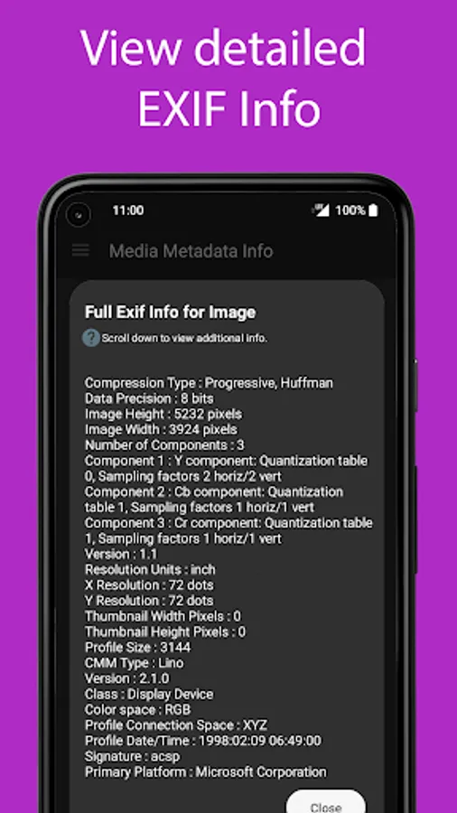 ▪️ View EXIF metadata info like image resolution, device model, etc for images.