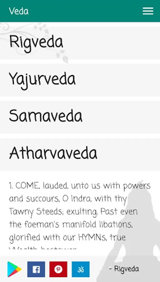 Rigveda is the first of the four Vedas. Rigveda means a Veda of praise. This Veda has several verses (hymns). This Veda is also the oldest Hindu holy book.