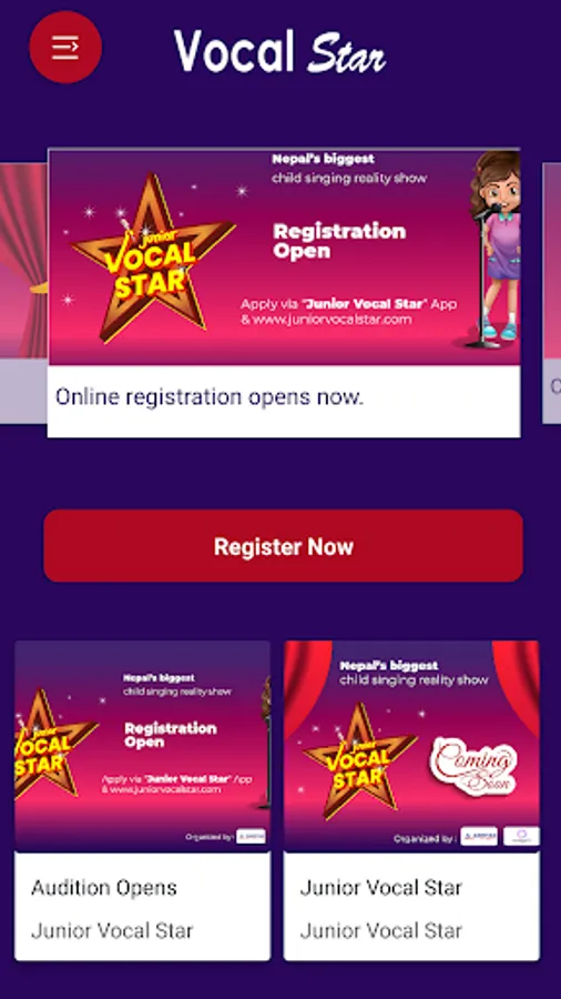 Junior Vocal Star is first of its kind Television show being produced in Nepal targeting the young talents below 15 years of age. The program format is based on singling reality show. The main aim of this program is to go that extra mile to hunt the young singing talents and provide them ample exposure through their singing talent. Abhiyan multimedia is proud to present the first ever singing reality show targeting the young talents. Junior Vocal star is a perfect platform for the young talents to showcase their singing talent and open door for a career in Singing.
