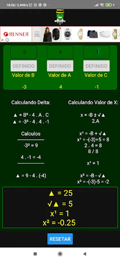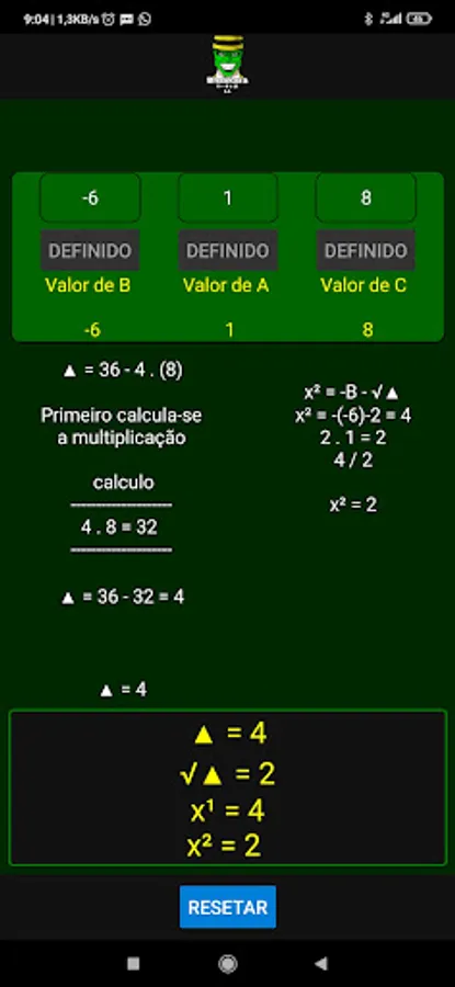 The App calculates and provides results using the Bhaskara formula. Not only does it provide the results, it also displays detailed explanations and teachings of how the calculation is being performed.
