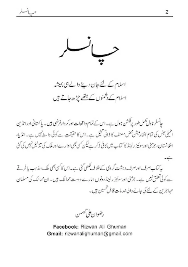 Rizwan ali Ghuman is one of those Urdu novelist who are struggling for the development and advance of Urdu literature despite bad conditions. He is a new comer in the realm of novel writing who is advancing by leaps and bounds. He is a contemporary novel writer and on his credit there are travelogues besides romantic action thriller and adventurous novels.