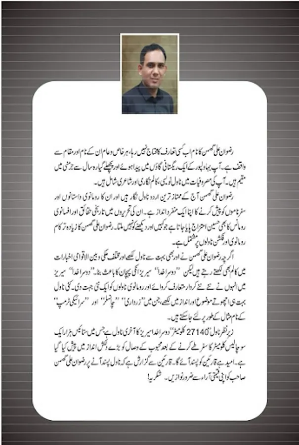 Rizwan ali Ghuman is one of those Urdu novelist who are struggling for the development and advance of Urdu literature despite bad conditions. He is a new comer in the realm of novel writing who is advancing by leaps and bounds. He is a contemporary novel writer and on his credit there are travelogues besides romantic action thriller and adventurous novels.