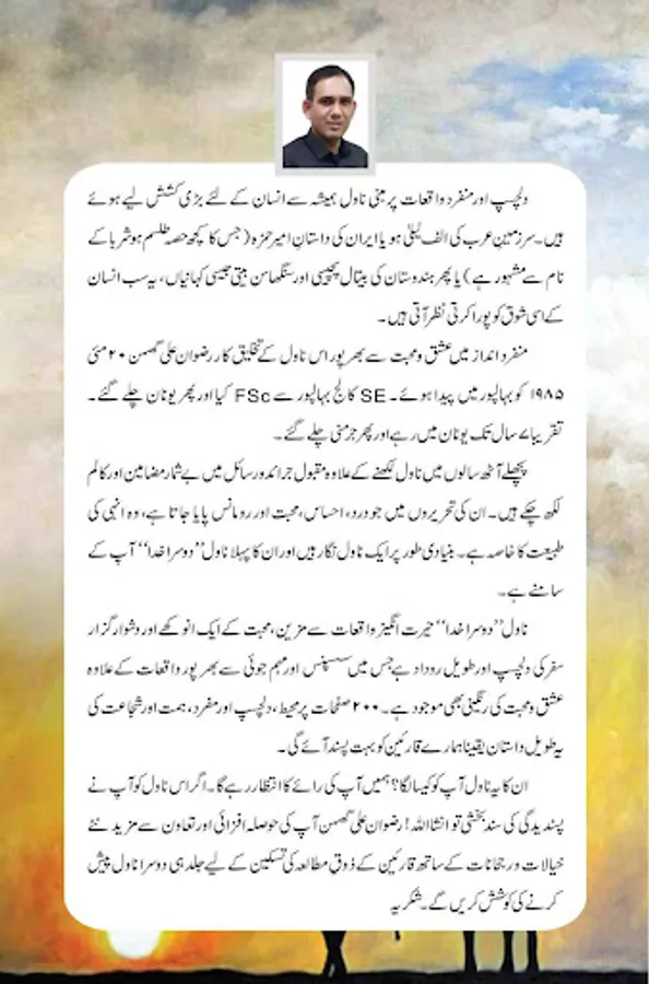 Rizwan ali Ghuman is one of those Urdu novelist who are struggling for the development and advance of Urdu literature despite bad conditions. He is a new comer in the realm of novel writing who is advancing by leaps and bounds. He is a contemporary novel writer and on his credit there are travelogues besides romantic action thriller and adventurous novels.