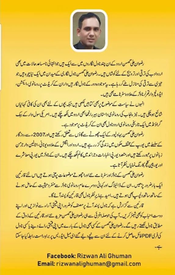 Rizwan ali Ghuman is one of those Urdu novelist who are struggling for the development and advance of Urdu literature despite bad conditions. He is a new comer in the realm of novel writing who is advancing by leaps and bounds. He is a contemporary novel writer and on his credit there are travelogues besides romantic action thriller and adventurous novels.