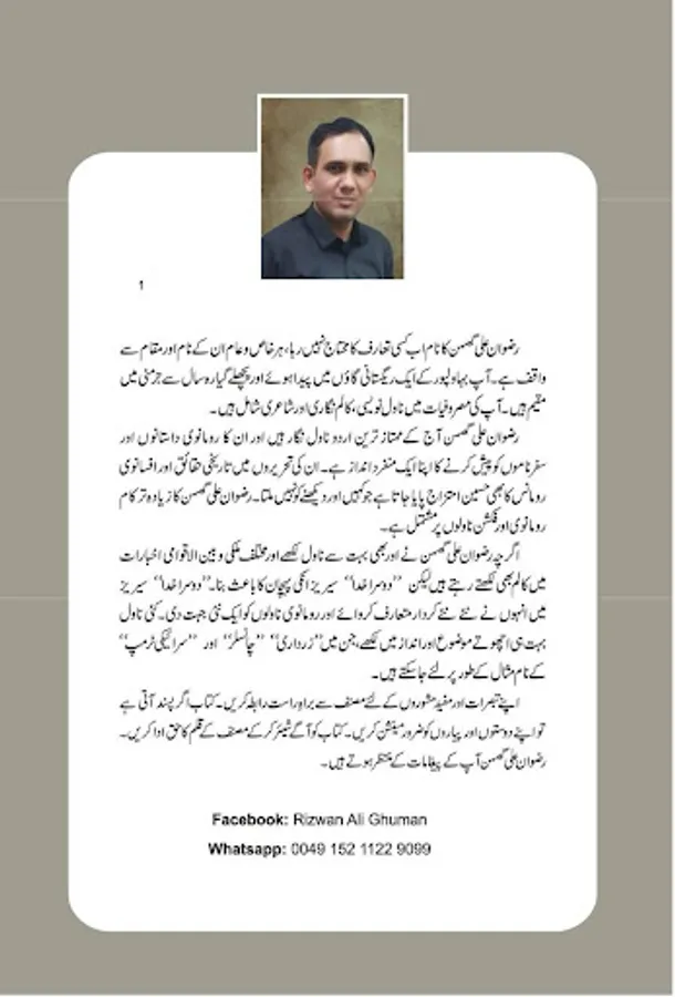 Rizwan ali Ghuman is one of those Urdu novelist who are struggling for the development and advance of Urdu literature despite bad conditions. He is a new comer in the realm of novel writing who is advancing by leaps and bounds. He is a contemporary novel writer and on his credit there are travelogues besides romantic action thriller and adventurous novels.