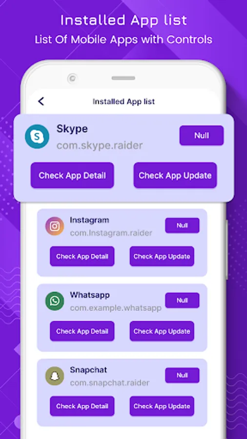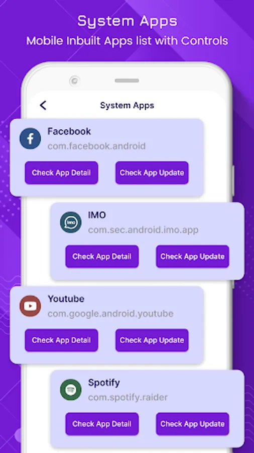The application Update list is divided into Installed Apps, System Apps, and All Apps. In application update, you can easily check the app update by clicking on the Check App update button after that if the update is available you can update the app. In this, you can also check the app detail like version name, Version code, install date, last update date, package name, permissions, etc.