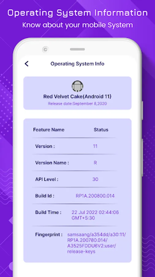 Operating System: In the operating System you get the information of the system. The information it provides is like a version, version name, API level, Build Id, and Build Time.