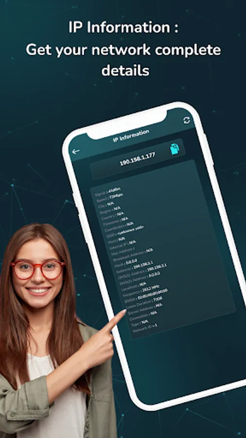 Collect all the information of IP Address and copy it with a simple touch. Find useful information details like signal, speed, city, region, country, timezone, coordinates, SSID, Host, Internet IP, DNS Address, Network ID, Server address, and many more.