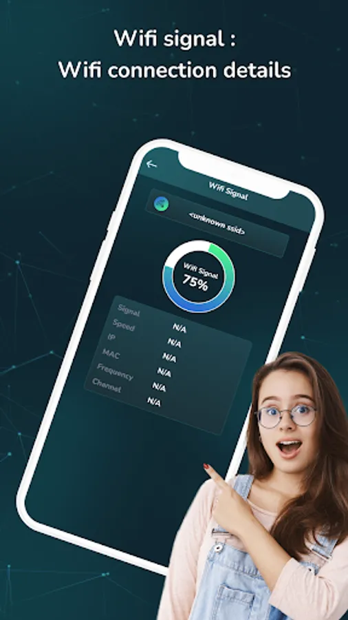 View all wifi signal details like signal name, speed, IP, mac, frequency, and Channel details.