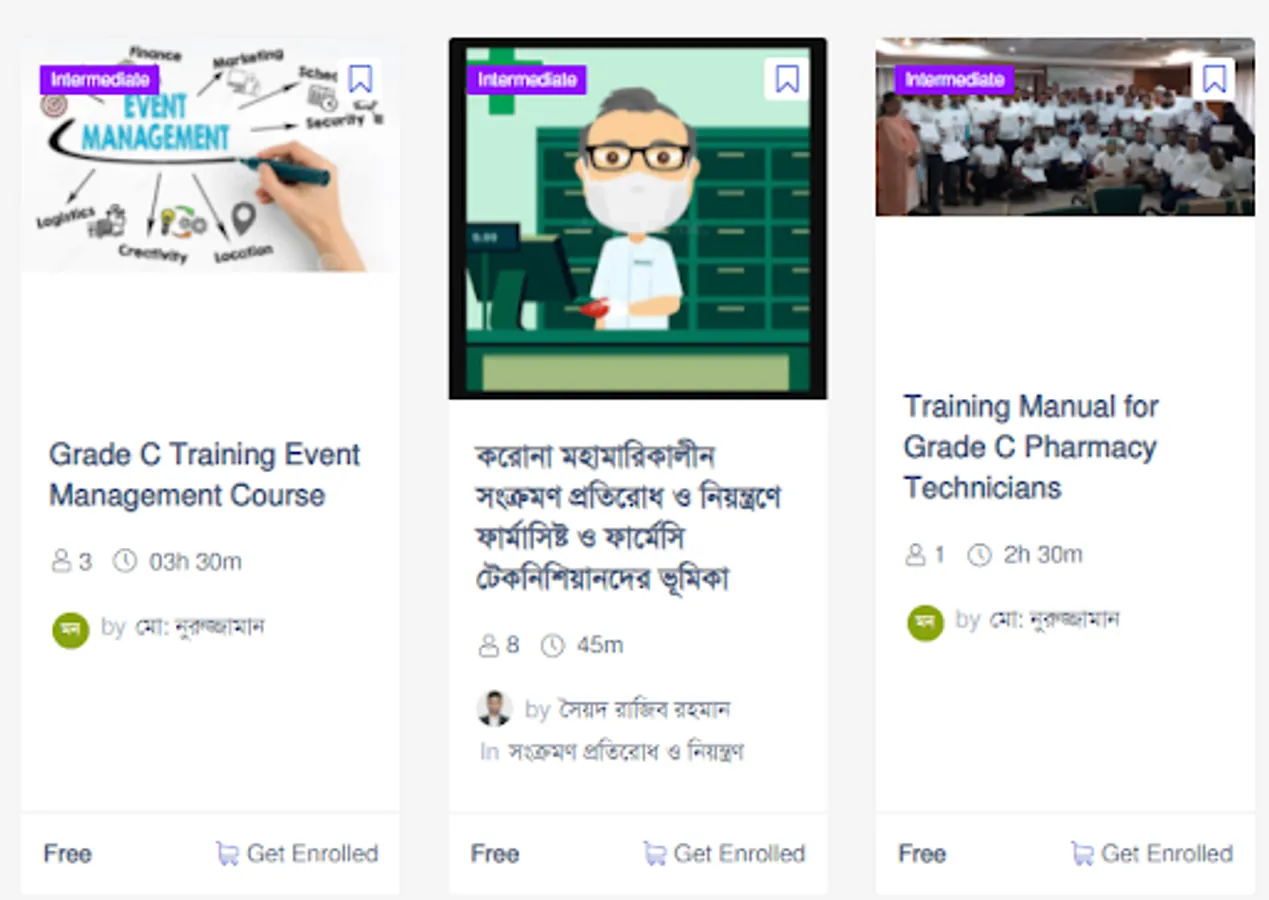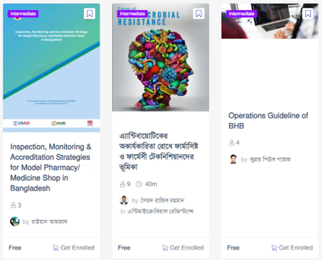 BHB has operating an online learning management system on Good Pharmacy Practice (GPP). Anybody can enroll him or her to one or more of the online courses for free of cost. The learned teachers or experts can also contribute online course on GPP fully controlled by the tutor. The course contents include texts, audio, video and online quizzes and questions for testing the depth of learning.