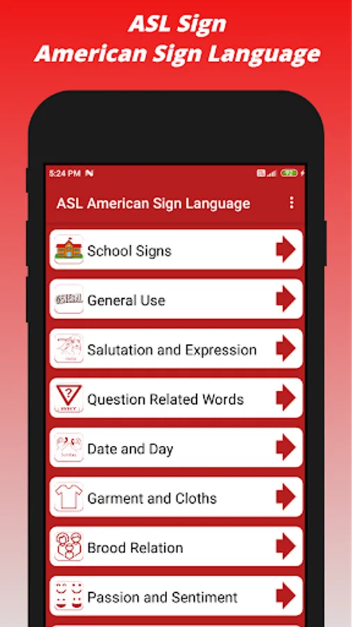 ASL American Sign Language App collections of Categories are below and provide all this Topic Like,