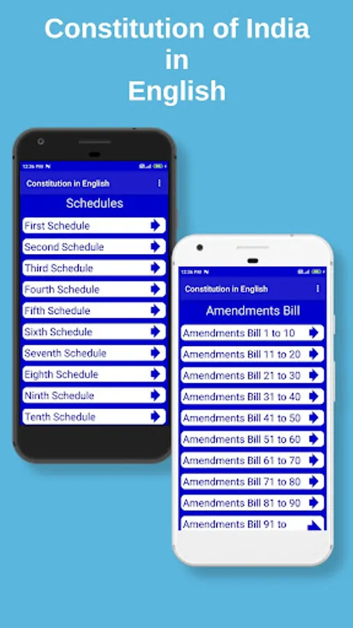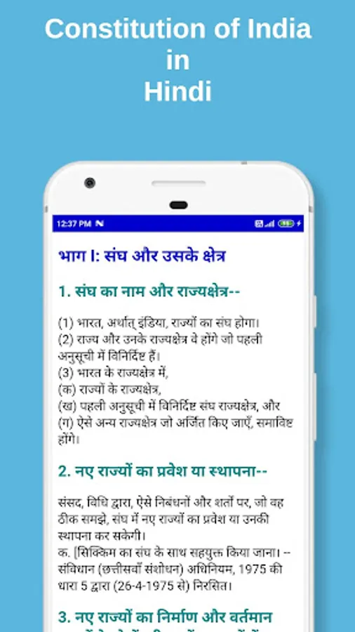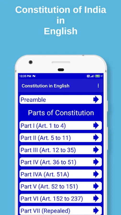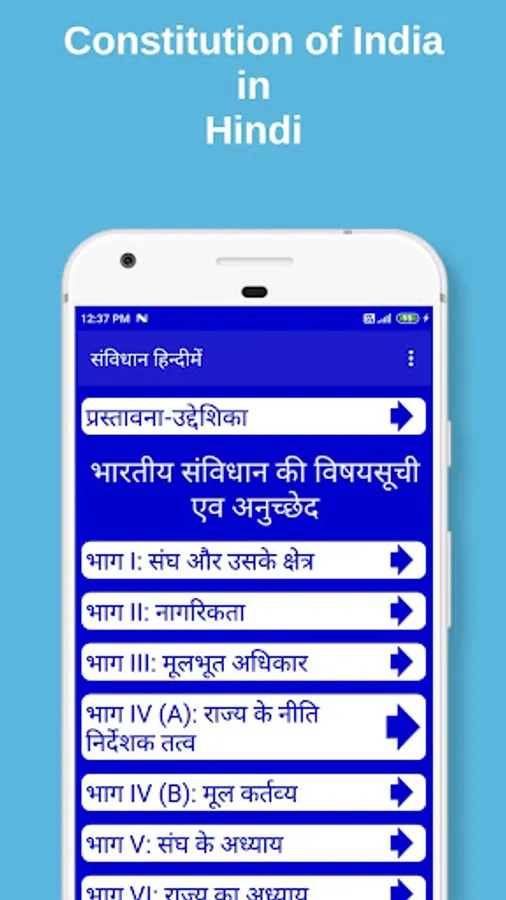 Bhartiya Samvidhan App contains the information about Constitution of India which includes Preamble, full description of Articles with its parts and the Schedule. This application will enhance your knowledge about Indian constitution which helps you to know about the rules and regulation and also help to solve the question asked in examination