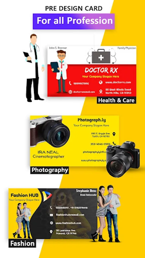 You can design your own business card & visiting card using this Business Card Maker App. Personalize your business card to reflect your personality by sharing Digital Business Card.
