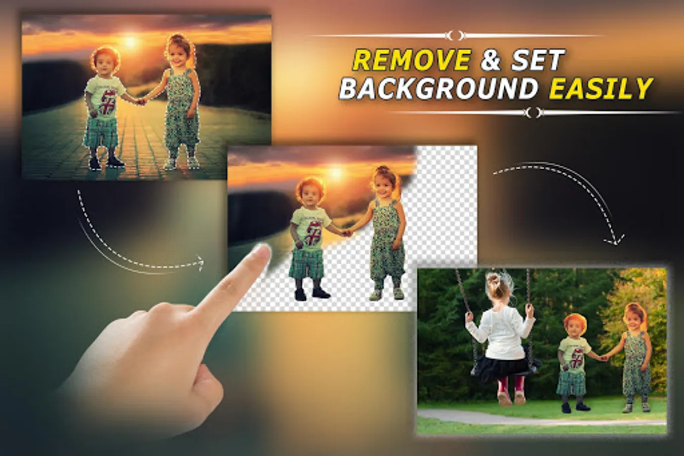 Do you want to create photos with awesome background images? That's where Photo Background Changer helps you don't need advanced Photo editor skills to have a photo of you hovering over the Grand Canyon or any surreal landscapes. Just open a photo you want modified, select the main element you want to keep and after that the background becomes transparent. This lets you choose another photo for the background from gallery or camera snapshot, now you have your own masterpiece.