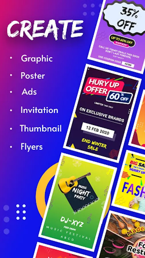 Poster Maker app can create posters & flyers for all kind of events such as advertising, party, club, music, school, church & fitness events. You can create or design printable graphic flyers photo or web page flyers.