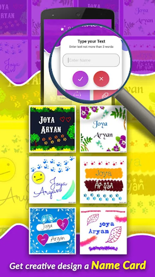 Just enter your name or any other text, you will get your name in different styles with different decorative items like heart shapes, strokes, feathers, different colorful background frames, color filters, love stickers & many more.