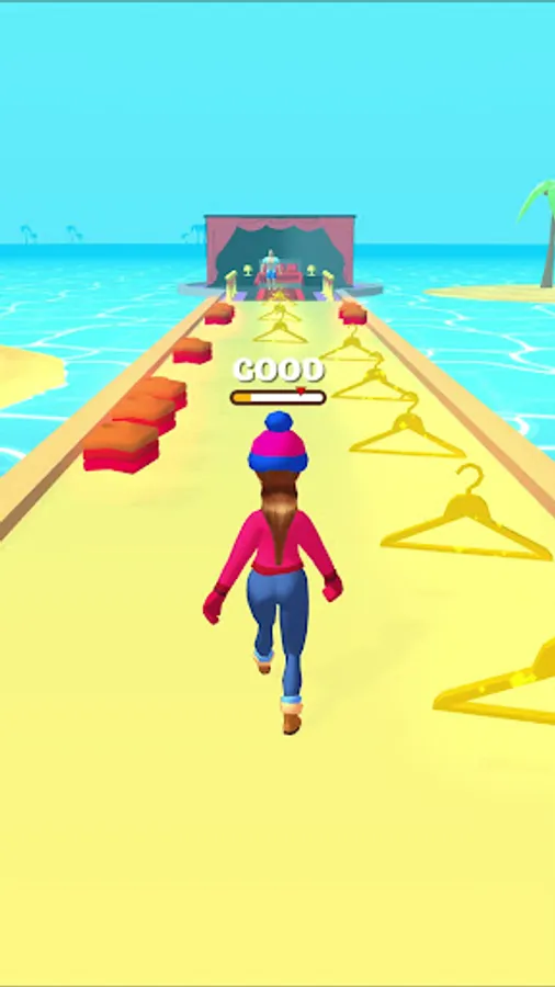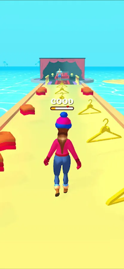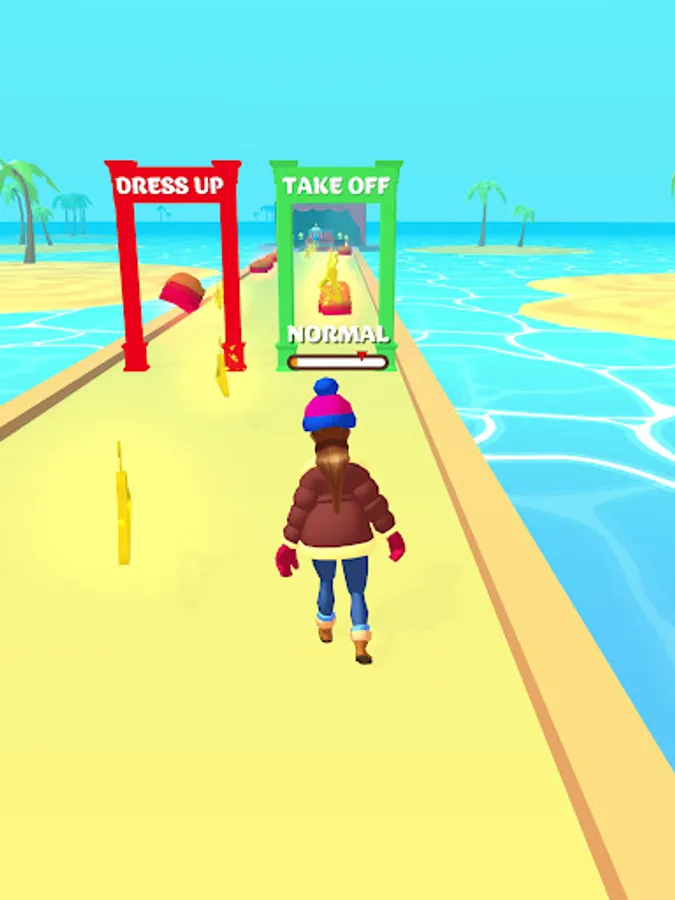 At the start of each level, the player has to run and change their character on the go. You can dress up or strip down to a bikini, and the number of clothes affects the level results!