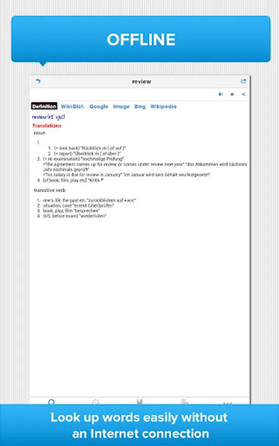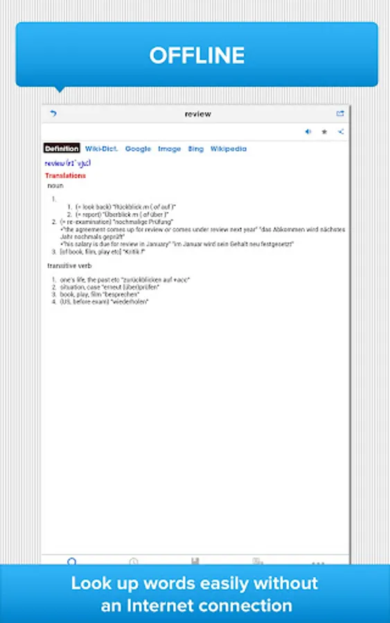 This German English dictionary is excellent for students, professionals and travelers using any Android devices. Our offline bilingual dictionary allows you to look up words easily without an Internet connection. If you have a connection, this great app lets you quickly connect to other popular online dictionaries, including Collins, WordReference, Larousse, Michaelis, for extra references.