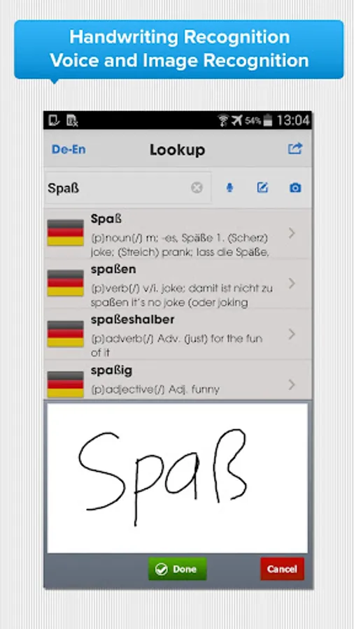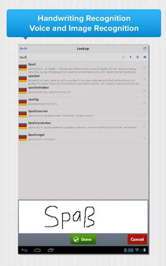 Packed with powerful features like Flashcards, Handwriting Recognition, Voice and Image Recognition, BH English German Dictionary is a handy reference tool and translator.