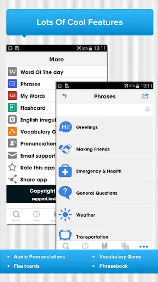 • Phrasebook includes about 1000 frequently used phrases, organized into 24 major topics