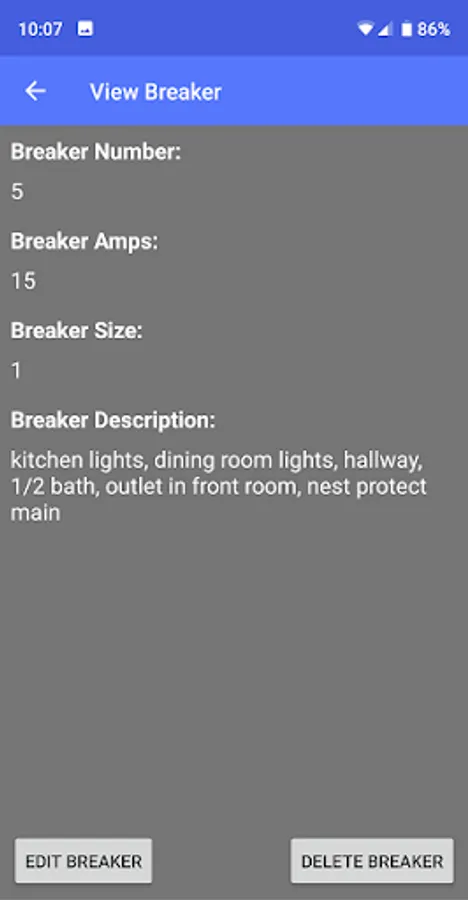 Breaker Panel for home and business use. Allows users to create a dynamically sized circuit breaker panel and add/edit/delete breakers. Each breaker stores the breaker number, size (pole), amps, and description.