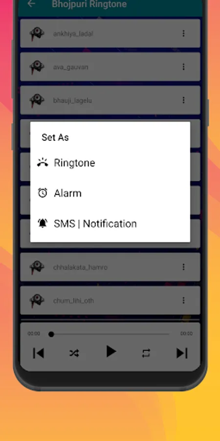 First, you can download this free Bhojpuri ringtone app, Then you can press the " play " button to listen to the ringtone, and to set it as ringtone click on three-dot(â‹®) and choose the ringtone you are done!