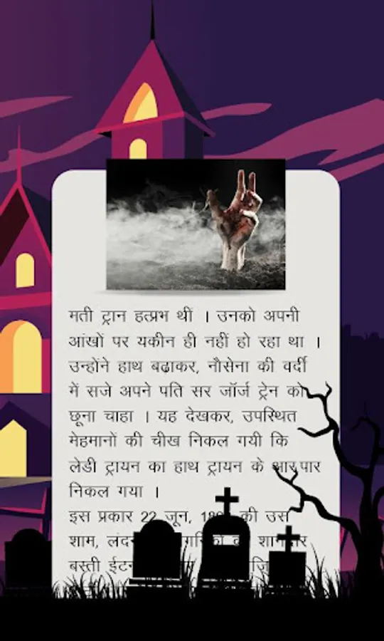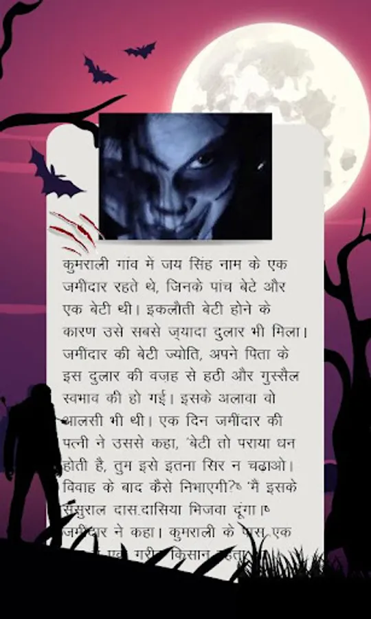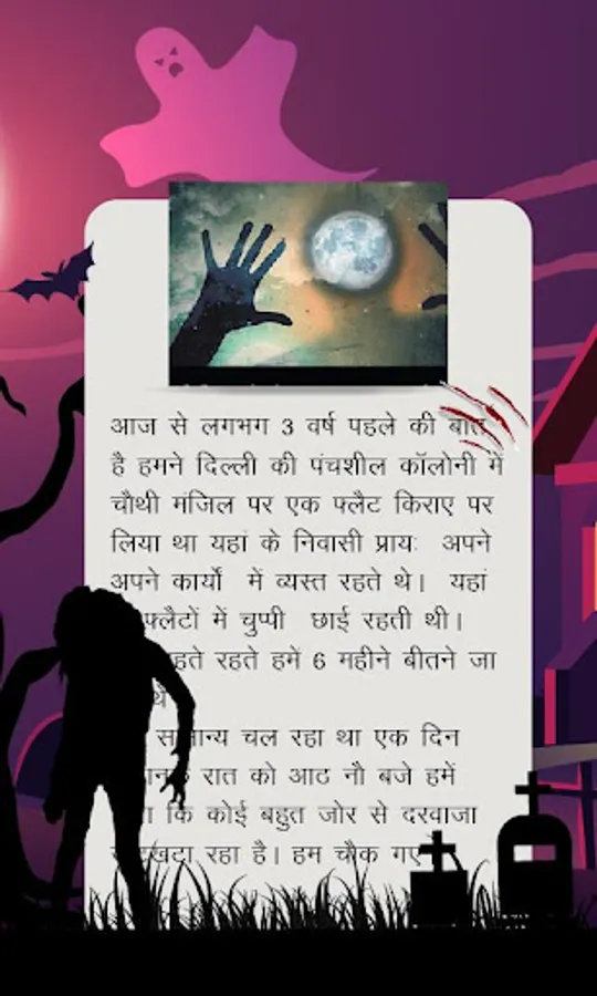 In this app we provide you large collection of horror stories in Hindi with horror theme UI. Scary and full of horror. We have selected them with extra effort to make sure the reader gets shivers down the spine. A great resource for late night storytelling and camping.