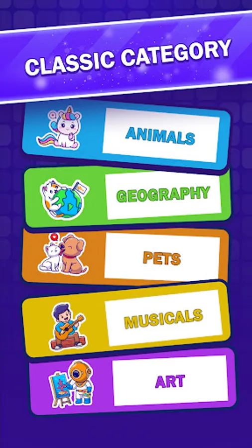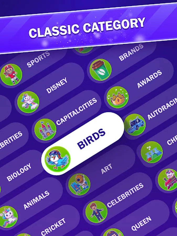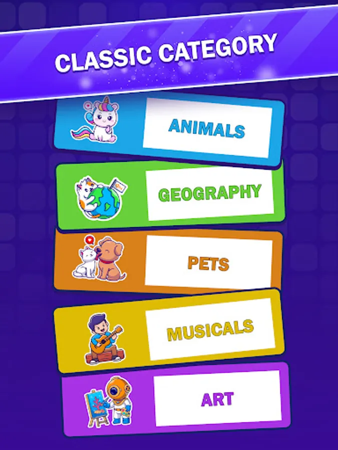 Play with over 40+ categories including - general knowledge, science, animals, food, sports, music, movies, TV shows, and more!