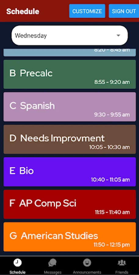 Schedule tracker: With our sleek scrollable user interface, you can easily find out what and when your next class is. You can personalize your classes by clicking the "Customize" button located on the header of the Schedule Screen.