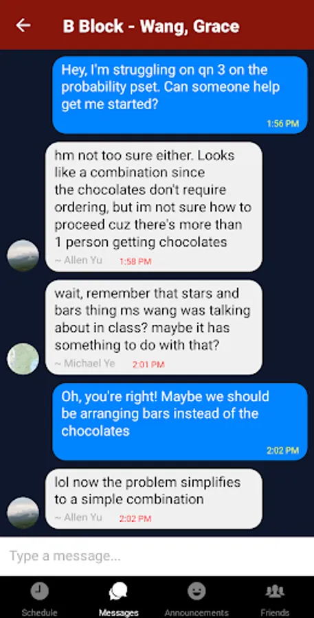 Automatic class group chat: Our app automatically creates a group chat for students enrolled in the same class. To ensure privacy among students, this screen is only available for students with brooklinek12.org domain emails. Our team reserves the right to not hand over text messages to teachers and administrators.