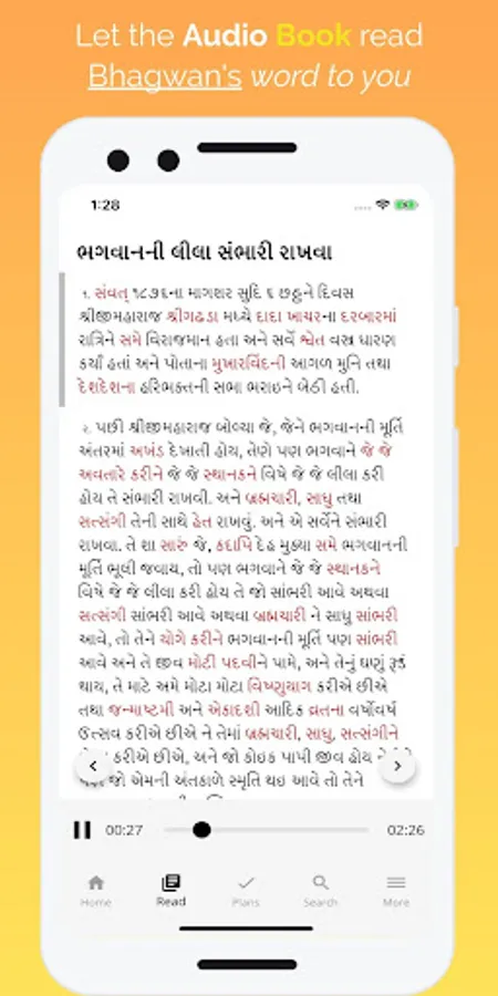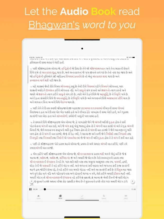 Listen to each Vachanamrut being read in Gujarati and follow along with the auto-scroll text. Great for those who are learning Gujarati or those who are having difficulty pronouncing difficult words. (Currently available in Gujarati, Gujarati Latin and Gujarati Phonetics mode).