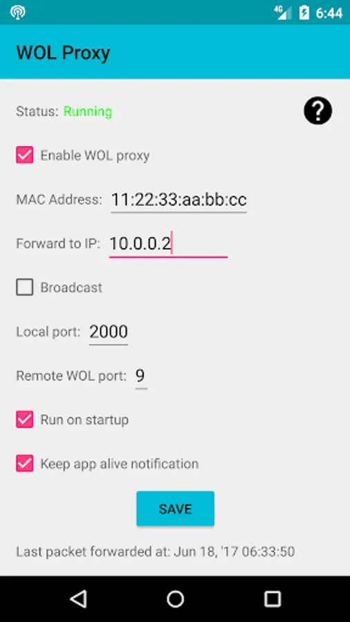 The original WOL packet that is sent should contain the MAC address of the sleeping device. Not the device that runs this app.