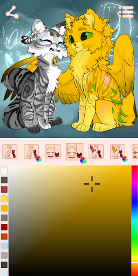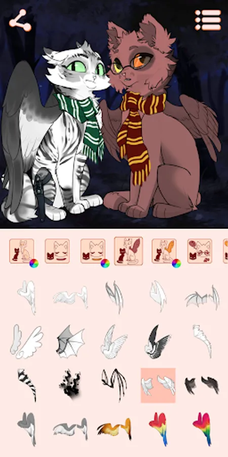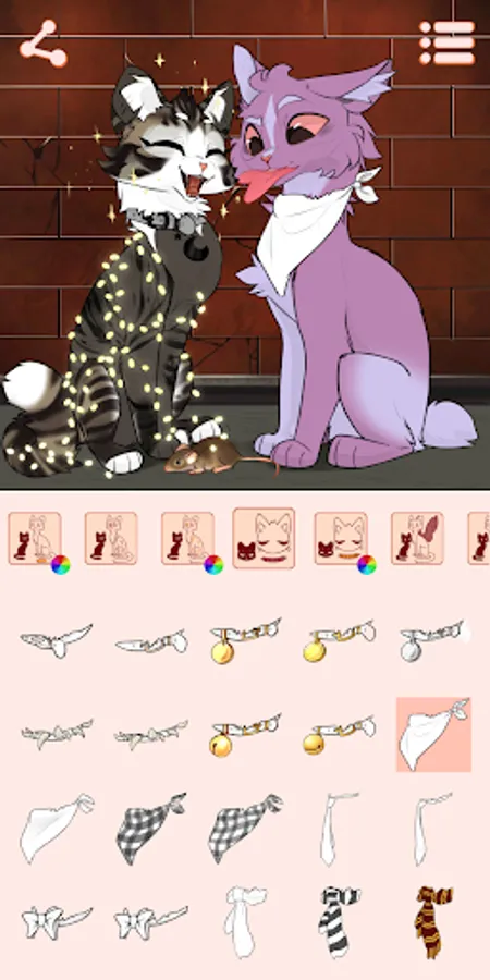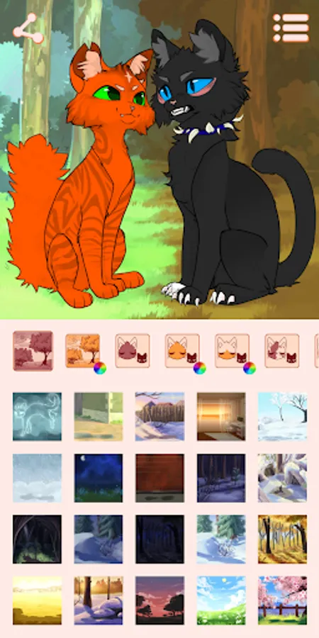 In this character constructor, you draw two cats at once! We've added a lot of items so that you can easily create your own original character (OC) or ship your favorite couple from books or cartoons. The setting isn't a problem either! You can get wild forest warriors, or house cats who won't take a step without their master.