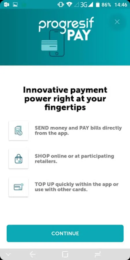 Progresif PAY lets you deposit and withdraw through ATM's, transfer money to friends and family, purchase e-cards seamlessly through eCredits, shop online, pay bills, and top up your mobile phone or electricity.