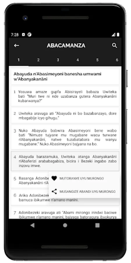 Binyujijwe mu izindi porogaramu nk'iz'imbuga nkoranyambaga, mushobora gusangiza imirongo ya Bibiliya na bagenzi banyu bakoresha izindi porogaramu. Kugirango mubigereho, kimwe no gutoranya umurongo, mugomba gukanda igihe kirekire ku murongo mwabona akadirishya kabyerekana mukarekura.