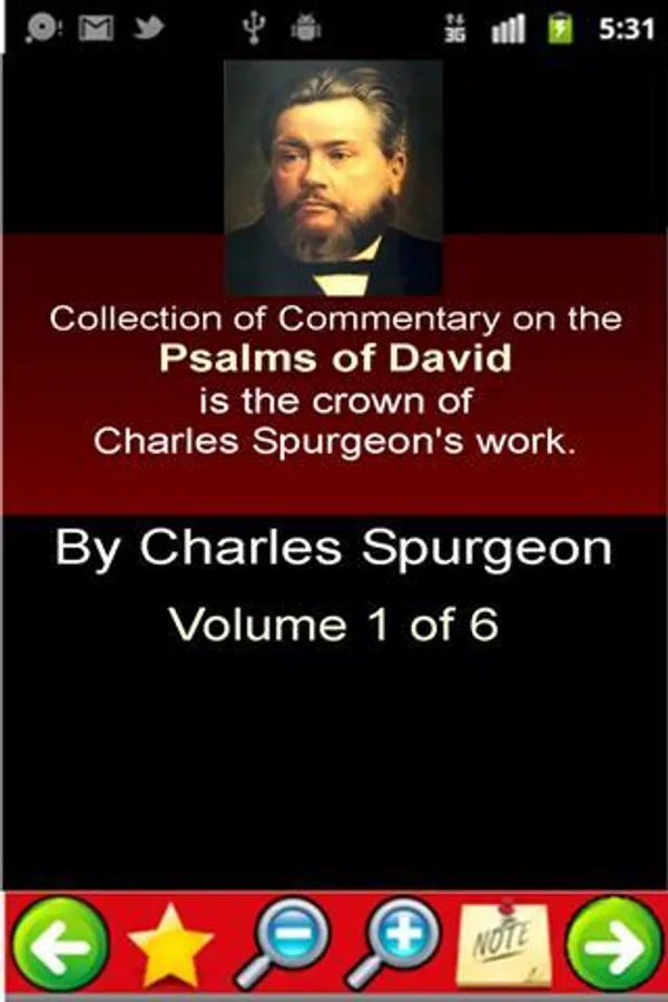 The Complete 6 Volume collection of commentary on the Psalms of David is the crown of Charles Spurgeon's work. 4,778 Pages is available on the Android Market.