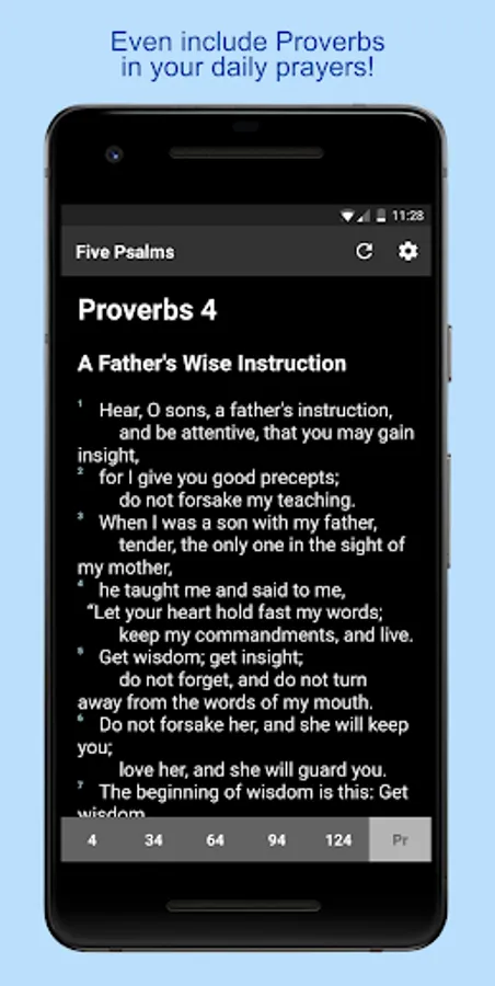 This app was inspired by Whitney's "Psalms of the Day" prayer approach. Instead of having to do the math each day and manually flipping to each psalm in a physical Bible, this app automatically looks up today's date, does the math, and displays for you the exact five psalms for the day. You can read through a psalm by swiping up and down, and switch to a different psalm by swiping left and right.