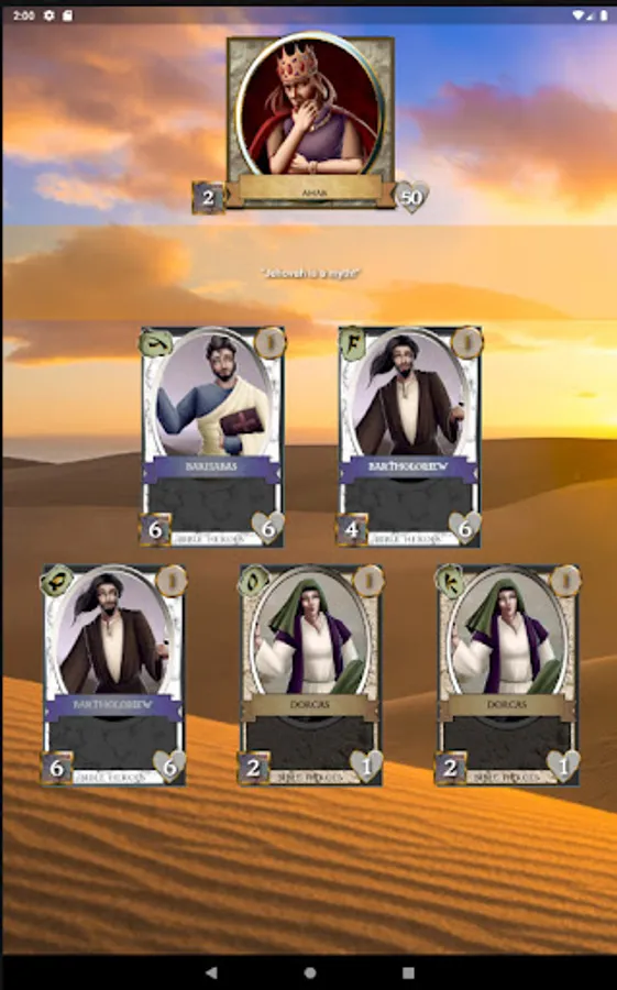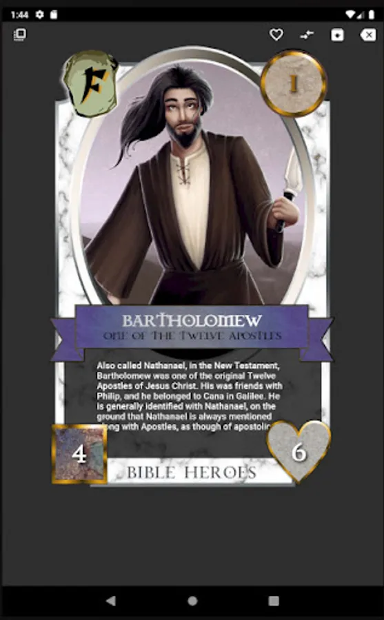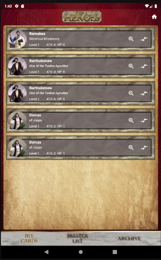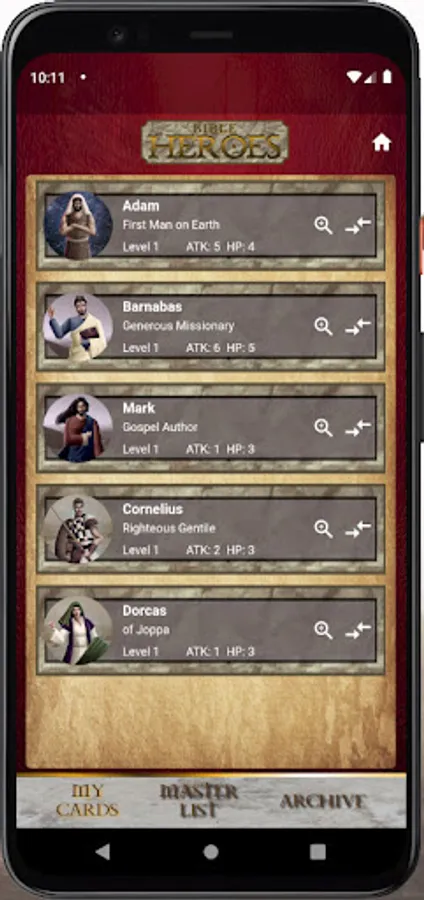 This app brings the characters of the Bible to life in a way you have never experienced before. Track your progress when reading the scriptures in the Bible, and then collect all of the cards of the heroes! Each card shows you a picture of the hero, gives details about their life, and lists the scriptures where they can be found. If you get more than one of a card, then trade it with a friend! Once your collection is at legendary level, you can journey on a campaign to take on the villains of the Old and New Testaments yourself!