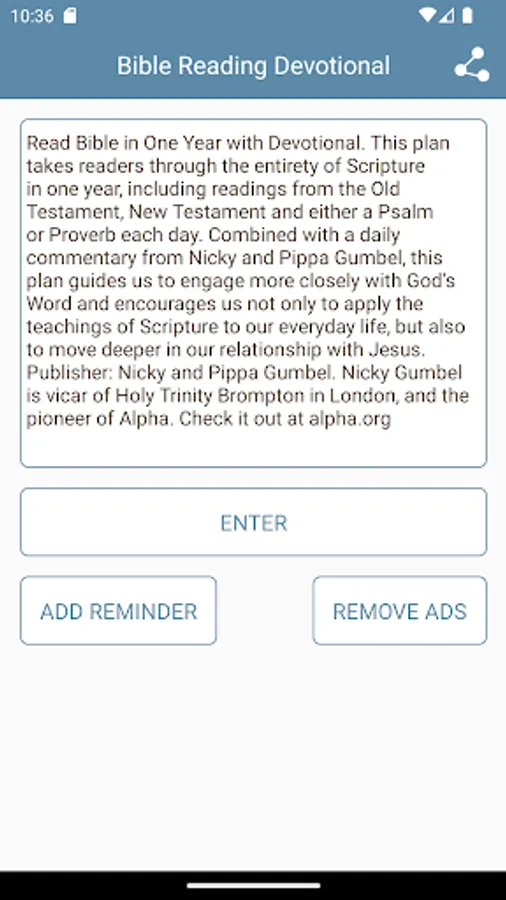 Read Bible in One Year with Devotional. This plan takes readers through the entirety of Scripture in one year, including readings from the Old Testament, New Testament and either a Psalm or Proverb each day. Combined with a daily commentary from Nicky and Pippa Gumbel, this plan guides us to engage more closely with God’s Word and encourages us not only to apply the teachings of Scripture to our everyday life, but also to move deeper in our relationship with Jesus. Nicky Gumbel is vicar of Holy Trinity Brompton in London, and the pioneer of Alpha. Check it out at alpha.org