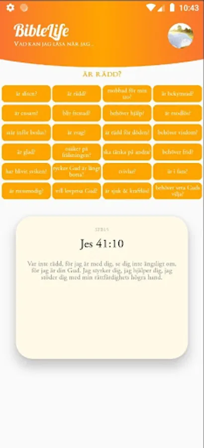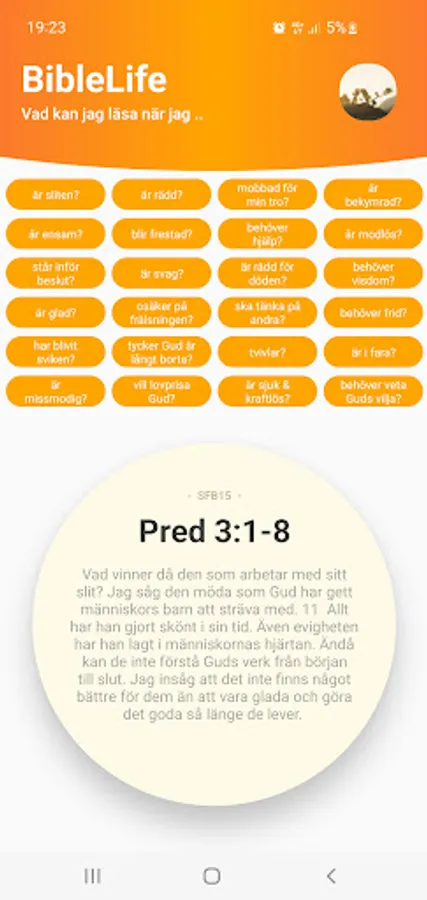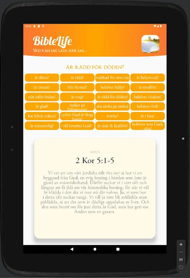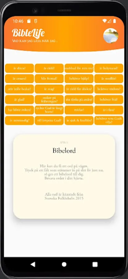 The app contains many different Bible words that are randomly given depending on what the user chooses for the choice of mood / situation in life.