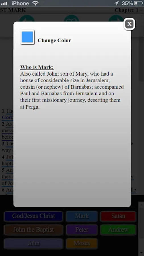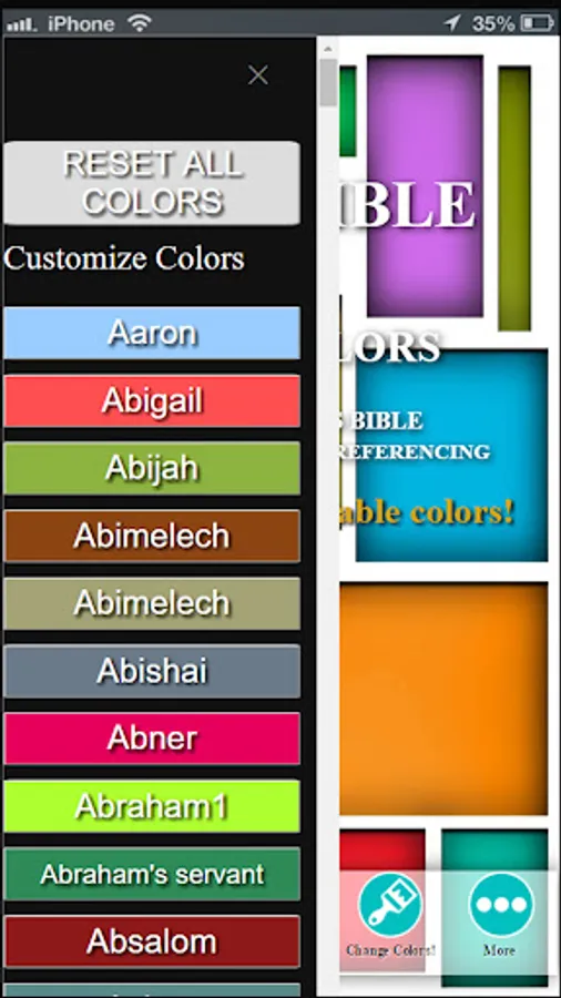 The Bible of Many Colors is a King James Bible(KJV Bible) in color text referencing. It is a Bible app that is a color-coded version of the Holy Bible. It takes each person writing, speaking and/or being referred to in each book of the Bible scriptures and assigns him or her an individual color. The color-coding system is labeled in a key at the bottom of each page, the reader will then know who is writing, speaking or being referred to in each sentence throughout each book in the Bible. You also now have the ability to change the colors to anything you like! The colors for each person can be customized in anyway to your liking.