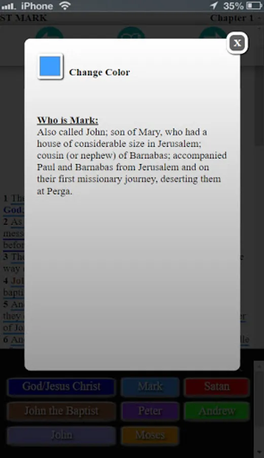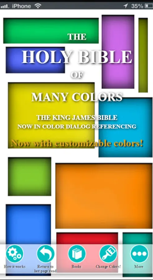 The Bible of Many Colors is a King James Bible(KJV Bible) in color text referencing. It is a Bible app that is a color-coded version of the Holy Bible. It takes each person writing, speaking and/or being referred to in each book of the Bible scriptures and assigns him or her an individual color. The color-coding system is labeled in a key at the bottom of each page, the reader will then know who is writing, speaking or being referred to in each sentence throughout each book in the Bible. You also now have the ability to change the colors to anything you like! The colors for each person can be customized in anyway to your liking.