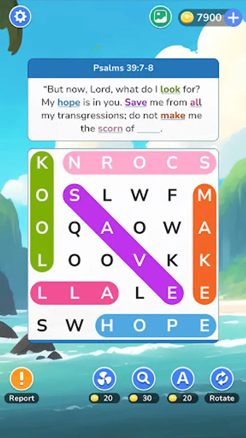 Bible word search games has thousands of diverse and difficult questions, from basic questions to advanced questions, related to books, chapters, verses, characters, events, teachings, and lessons in the Bible.