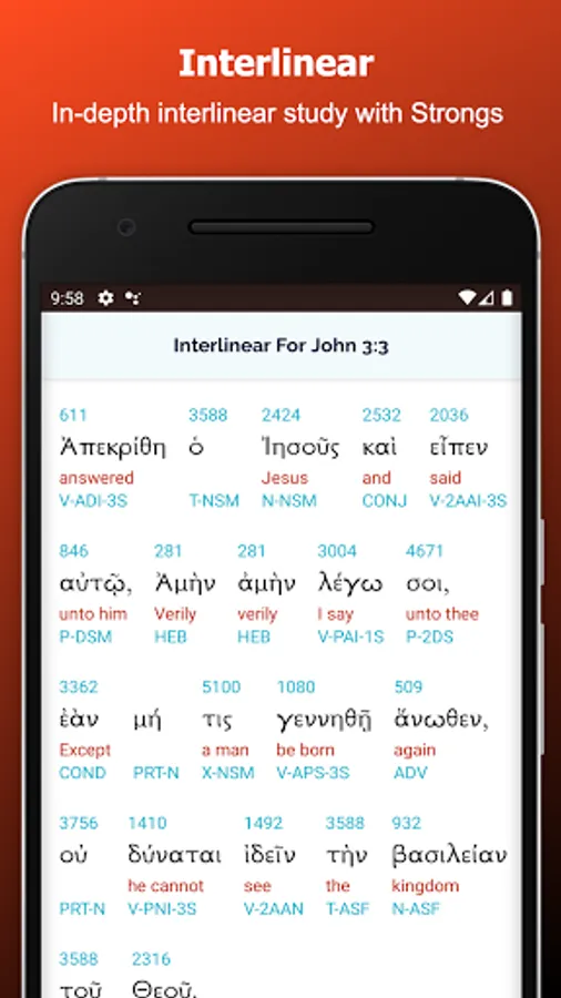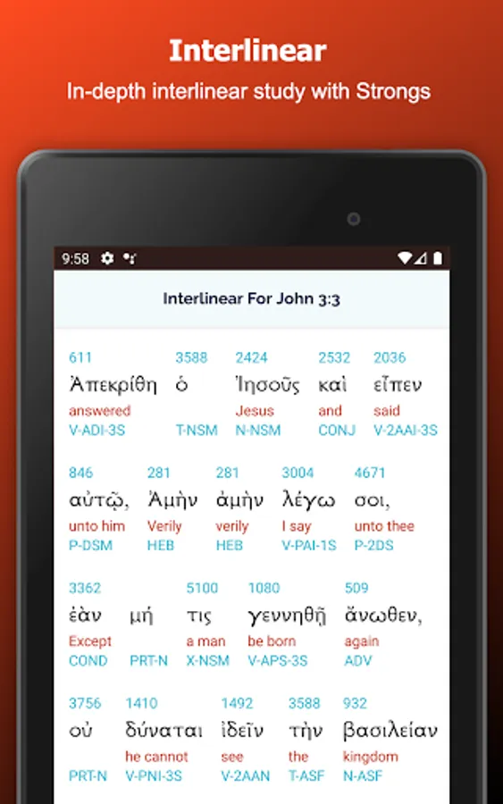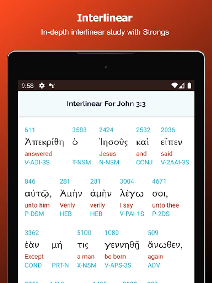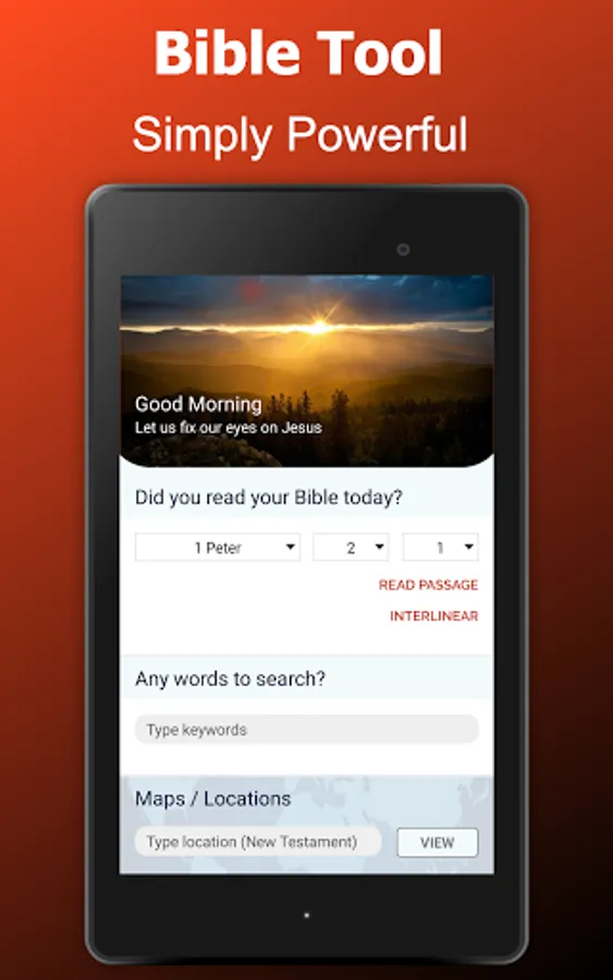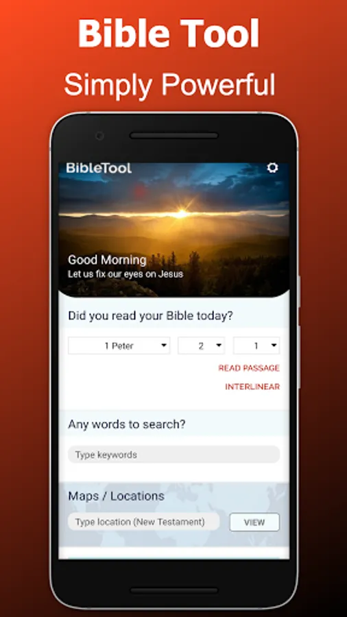 Bible Tool is a powerful Bible search engine. It is an advanced yet simple Bible App allowing you to also read, listen to narrations, study the Bible interlinear, explore Bible maps and use many more study tools.