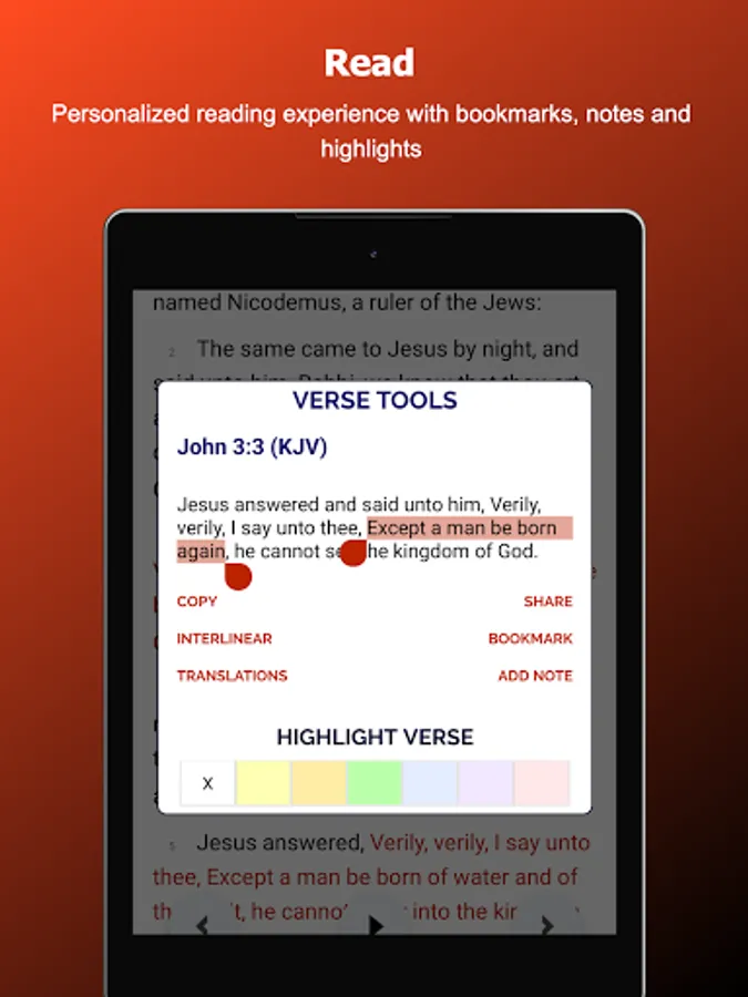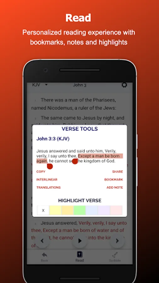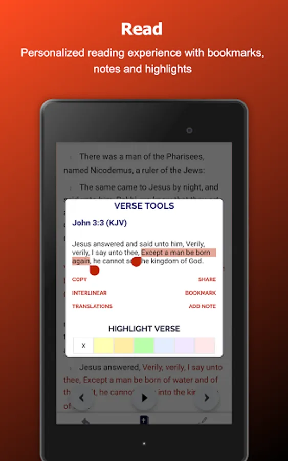 Add your personal touch to your studies by highlighting, bookmarking and organizing your favourite Bible verses and passages in custom categories of your choice.