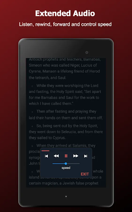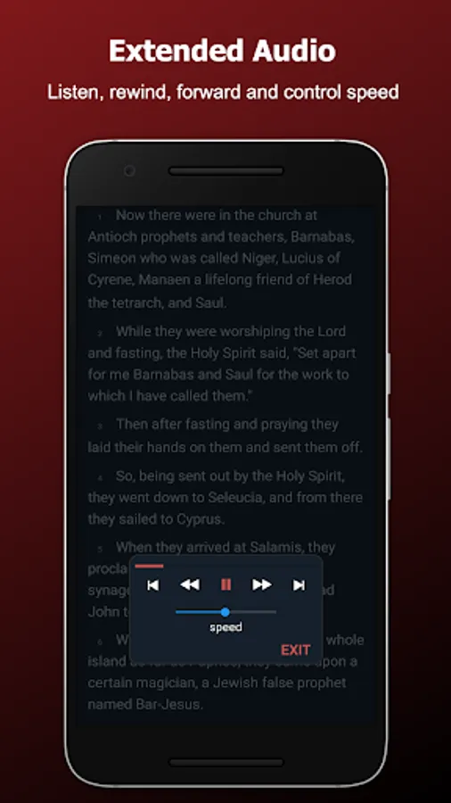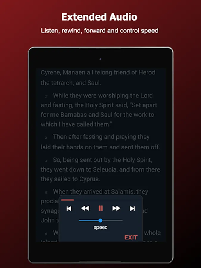 - Listen to the Bible narrations with our audio Bible reader (Rewind, Forward and Control narration speed);