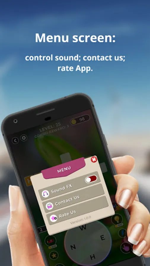 The ‘Settings’ icon signified by the gear button is where the user can mute the sound or keep it on; contact the developer by clicking ‘Contact Us’ or rate the App by clicking the ‘Rate Us’ button.