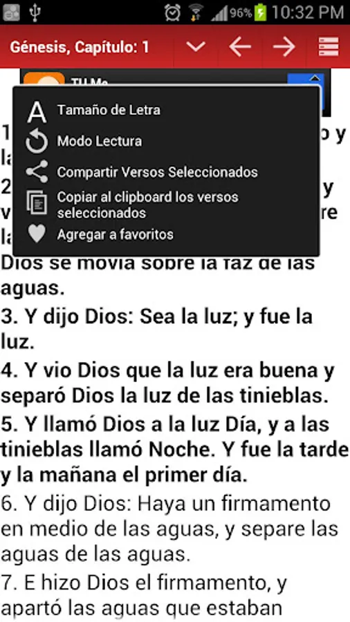 * Funcionalidad para copiar y compartir versos, presiona sobre el o los versos que quieres compartir y con el menú puedes compartirlo o copiarlo.